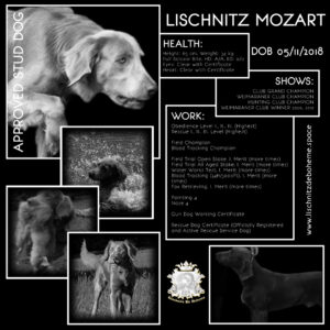 Mozart has great desire to work and is used for hunting, especially in field. He is not the dog, who just passed some exams, he is actively used for hunting living in hunting family in hunting areas.